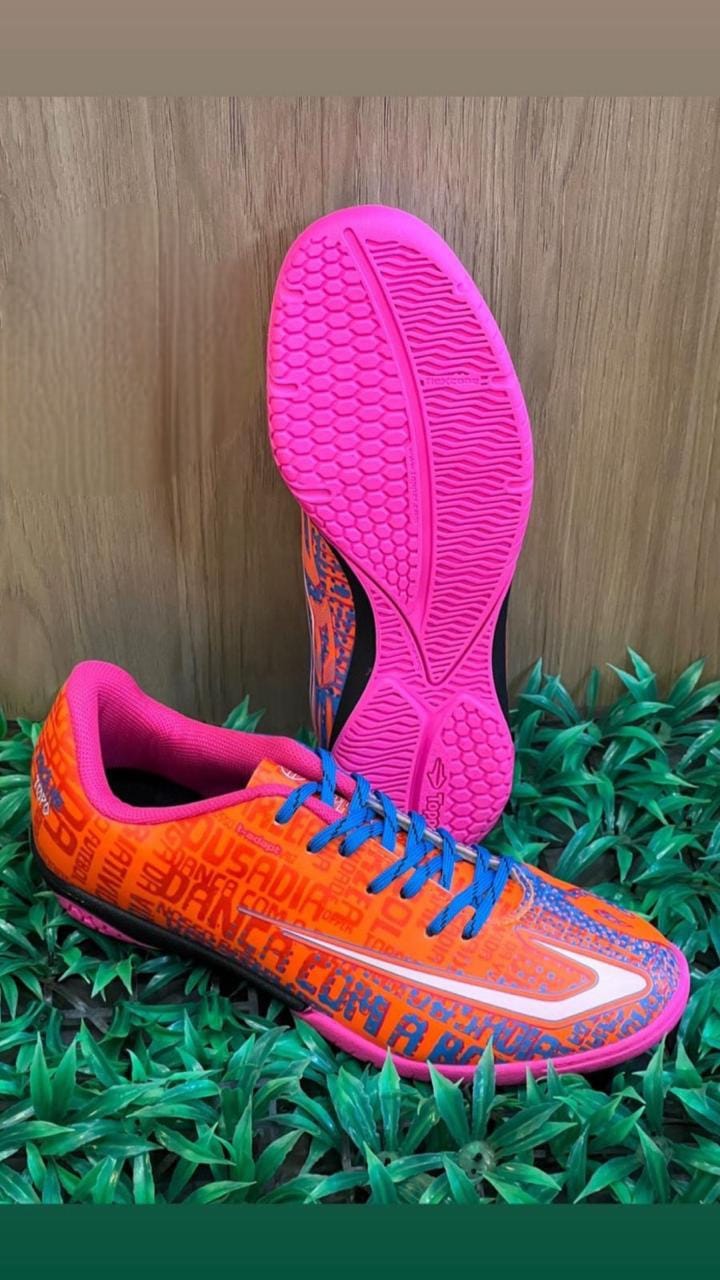 Cor: Laranja neon com detalhes em rosa e azul