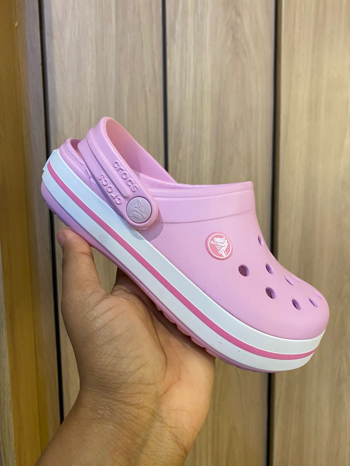 Design Moderno: A tonalidade rosa com detalhes em branco e o logo da marca Crocs em relevo trazem um visual cheio de estilo.