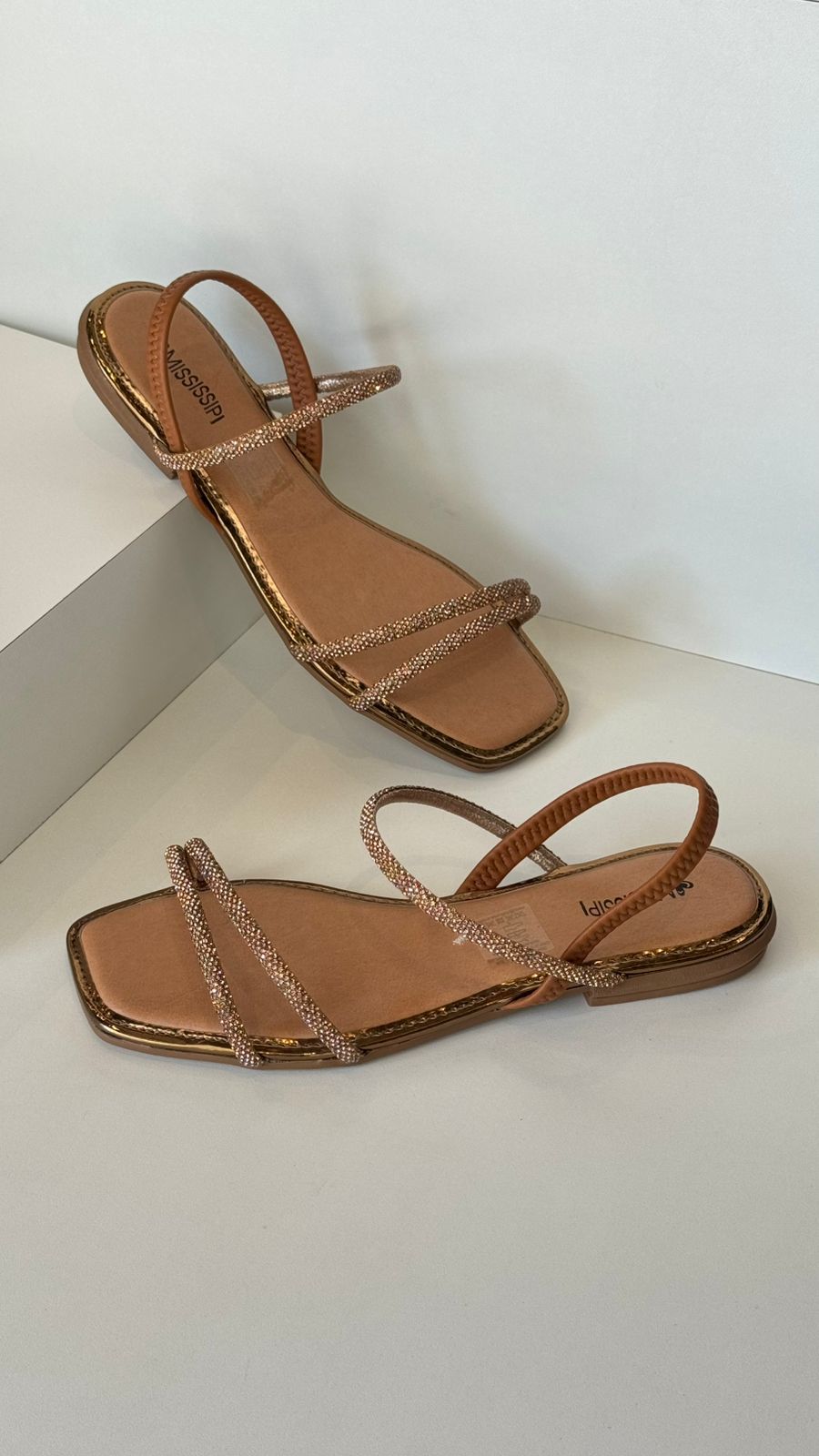 Modelo: Sandália rasteira com tiras brilhantes