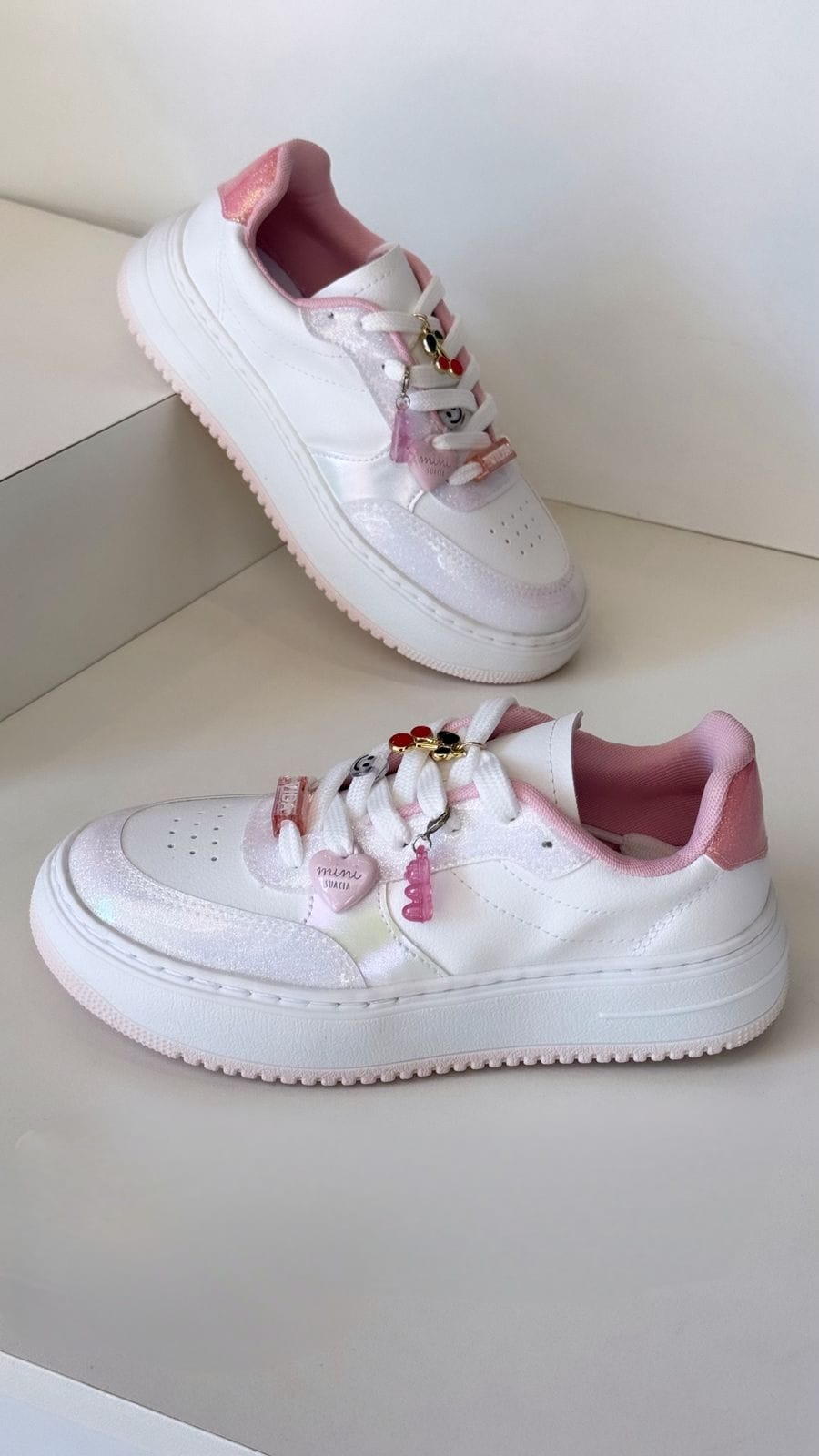 Acompanha pins personalizados super fofos (como coração, ursinho e cereja);