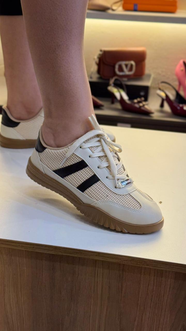 Detalhes: Listras laterais pretas, telinha respirável e etiqueta holográfica no cadarço