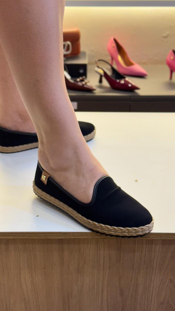 Detalhes: Acabamento em corda trançada no solado e logo metálico lateral