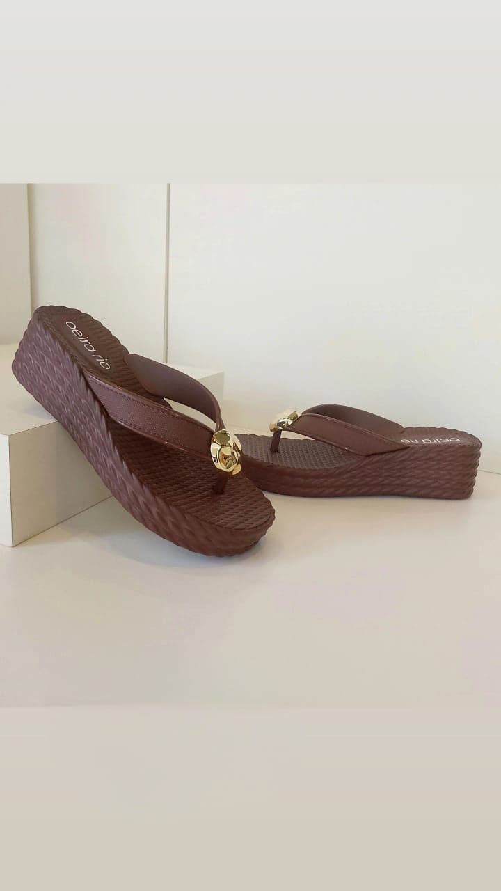 Design: Anabela média com tiras largas que oferecem firmeza e estilo