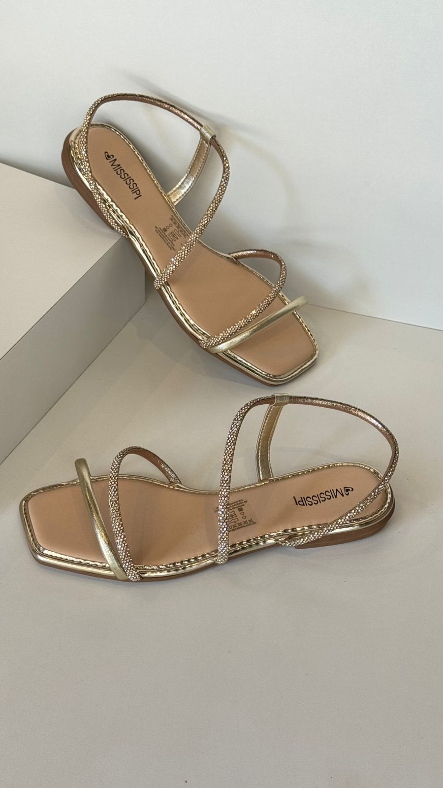 Modelo: Sandália rasteira dourada com tiras brilhantes
